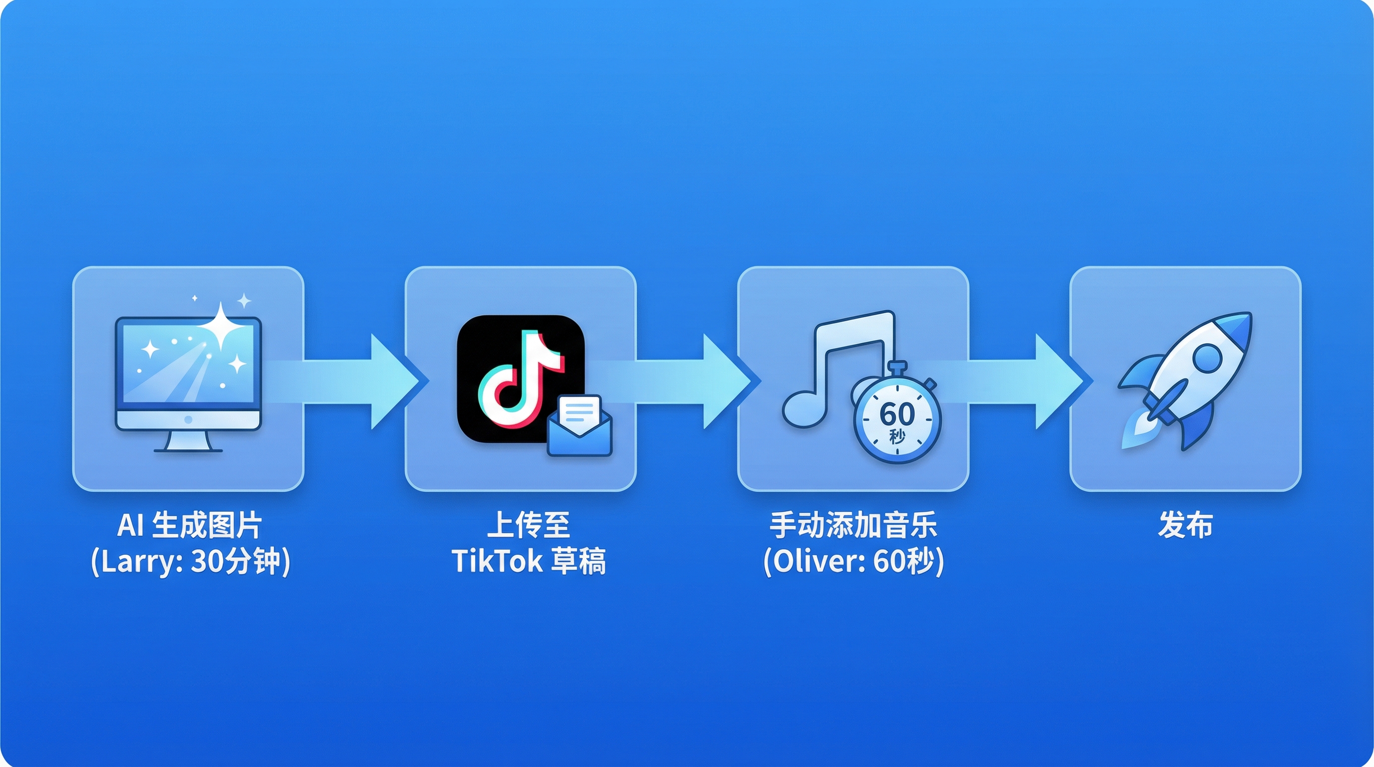 API 无法添加热门音乐,而热门音乐对播放量影响巨大。所以 Oliver 每天花 60秒 打开 TikTok,选一首热门音乐,粘贴 Larry 写的标题,发布。