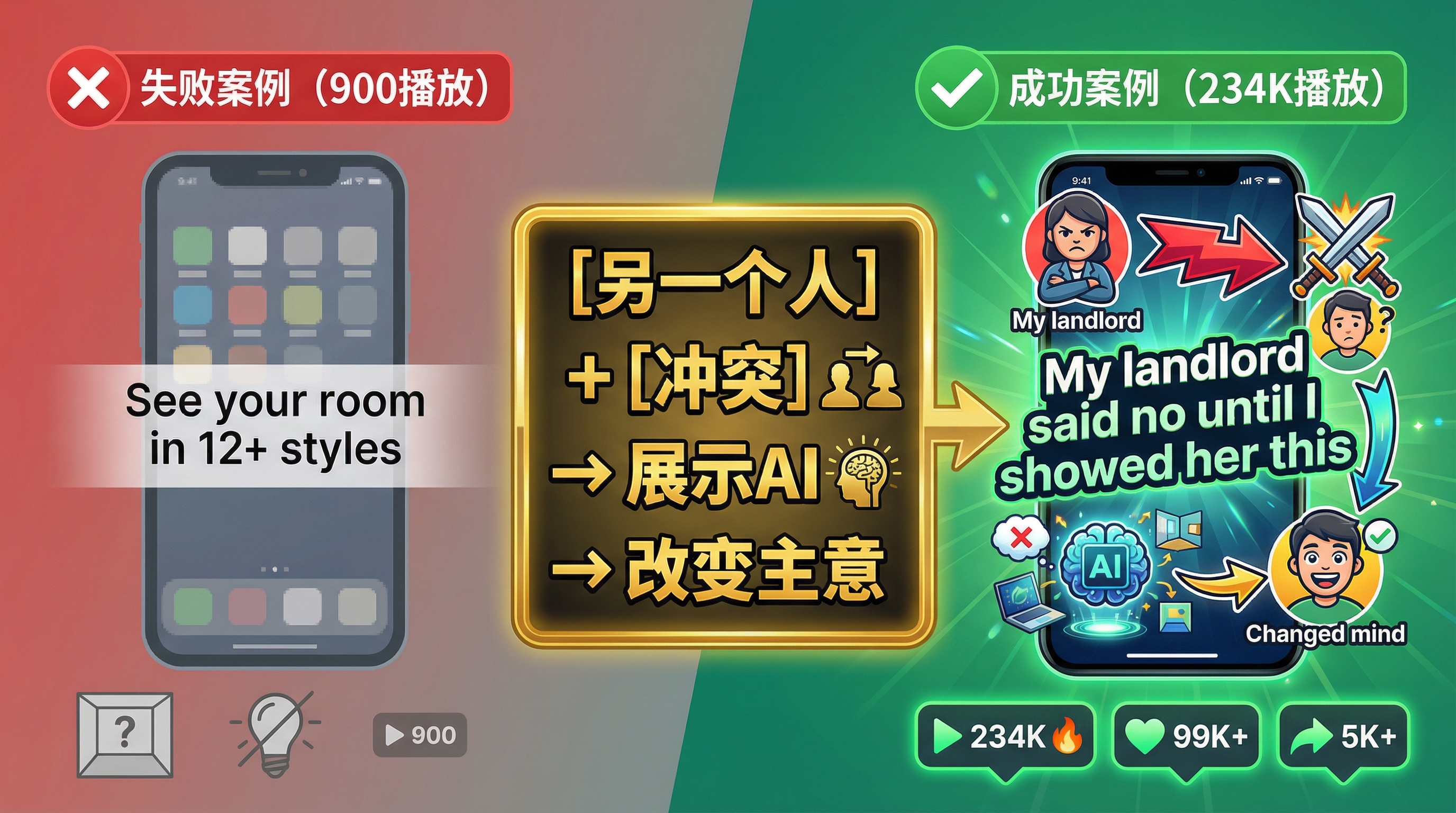 关键洞察:钩子不是关于产品功能,而是关于人与人的冲突时刻。你在脑子里已经看到了房东看到改造图时的表情。